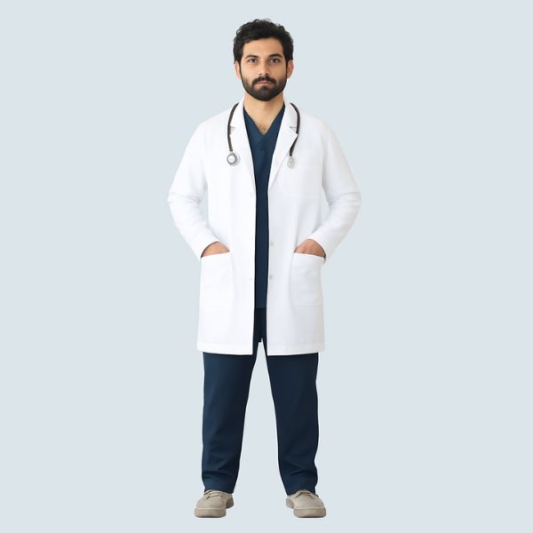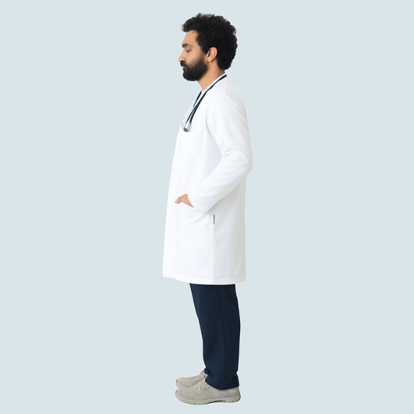 Classic button-up front and clean lapel for a sharp clinical profile.